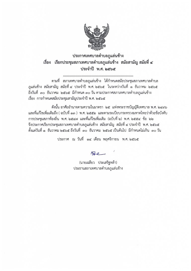 ประกาศเทศบาลตำบลภูแล่นช้าง เรื่อง เรียกประชุมสภาเทศบาลตำบลภูแล่นช้าง สมัยสามัญ สมัยที่ 4 ประจำปี พ.ศ.2565