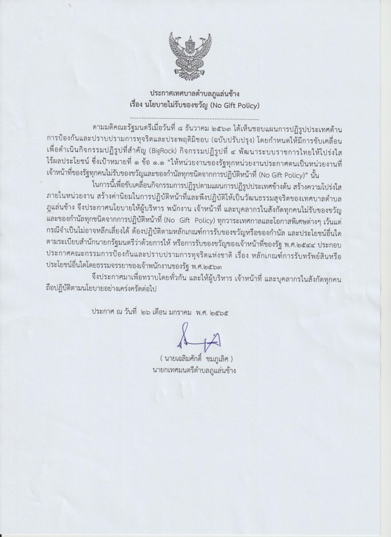 ประกาศเทศบาลตำบลภูแล่นช้าง เรื่อง นโยบายไม่รับของขวัญ (No Gift Policy)