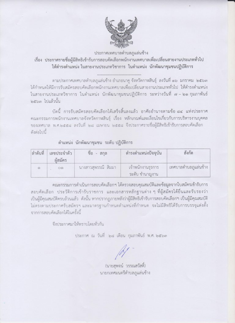 ชื่อเรื่อง : ประกาศเทศบาลตำบลภูแล่นช้าง เรื่อง ประกาศรายชื่อผู้มีสิทธิเข้ารับการสอบคัดเลือกพนักงานเทศบาลเพื่อเปลี่ยนสายงานประเภททั่วไป ให้ดำรงตำแหน่ง ในสายงานประเภทวิชาการ ในตำแหน่ง นักพัฒนาชุมชนปฏิบัติการ