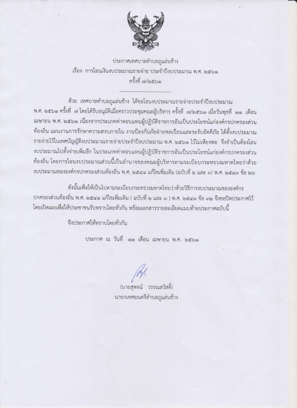 ประกาศเทศบาลตำบลภูแล่นช้าง เรื่องการโอนงบประมาณรายจ่าย ครั้งที่ 7/2561