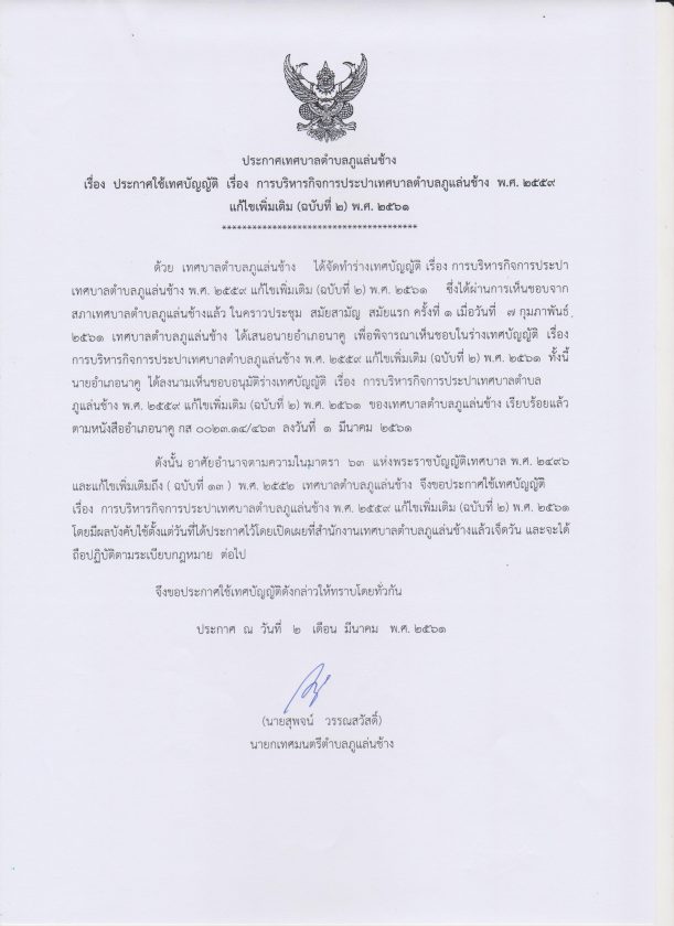 ประกาศใช้เทศบัญญัติ เรื่อง การบริหารกิจการประปาเทศบาลตำบลภูแล่นช้าง พ.ศ.2559 แก้ไขเพิ่มเติม