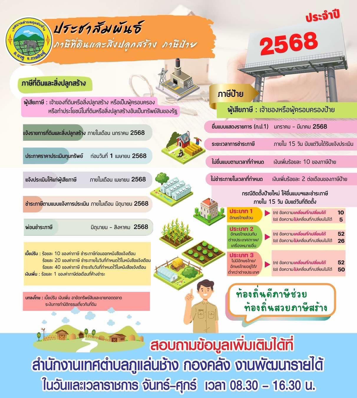 ชื่อเรื่อง : ประชาสัมพันธ์ เรื่อง ให้เจ้าของป้ายหรือผู้ครอบครองป้าย ที่ติดตั้งอยู่ในเขตเทศบาลตำบลภูแล่นช้าง อันต้องเสียภาษีป้ายประจำปี พ.ศ. 2568 ไปรับแบบพิมพ์และกรอกรายการใบแบบพิมพ์ เพื่อยื่นต่อพนักงานเจ้าหน้าที่ และเรื่อง การยื่นแบบแสดงรายการภาษีป้าย การยื่นคำร้องติดตั้ง รื้อถอน และเปลี่ยนแปลงข้อความป้าย